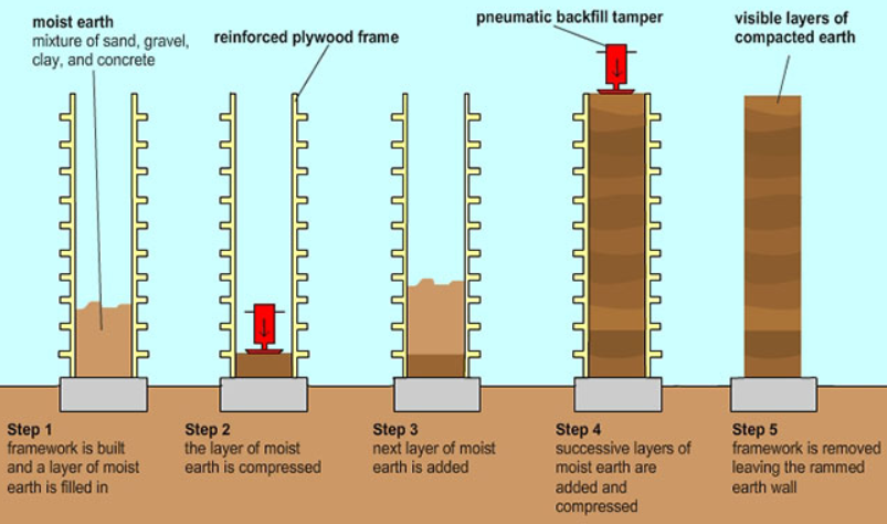 - Rammed Earth: Layers of damp soil are compacted within a temporary frame,